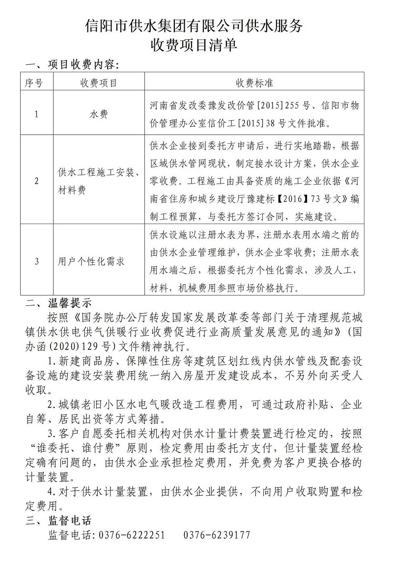 經(jīng)河南省發(fā)改委豫發(fā)改價管〔2015〕255號文件、信陽市物價管理辦公室信價工〔2015〕38號文件批準,從2015年4月1日起對市中心城區(qū)供水價格進行調(diào)整。河南省人民政府豫政〔2017〕44號文件對河南省水資源稅進行了調(diào)整,信陽市物價管理辦公室、信陽市財政局、信陽市城市管理局價調(diào)〔2018〕27號文件對我市污水處理收費標準進行了調(diào)整,具體如下:
